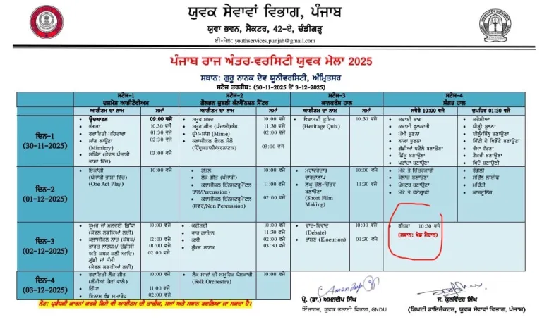 ਚੰਡੀਗੜ੍ਹ, 26 ਨਵੰਬਰ, 2025 (ਪੰਜਾਬੀ ਖਬਰਨਾਮਾ ਬਿਊਰੋ) : ਪੰਜਾਬ ਰਾਜ ਅੰਤਰ-ਯੂਨੀਵਰਸਿਟੀ ਯੁਵਕ ਮੇਲਾ ਗੁਰੂ ਨਾਨਕ ਦੇਵ ਯੂਨੀਵਰਸਿਟੀ ਅੰਮ੍ਰਿਤਸਰ ਵਿਖੇ 30 ਨਵੰਬਰ ਤੋਂ ਸ਼ੁਰੂ ਹੋਵੇਗਾ ਜਿਸ ਵਿੱਚ 3 ਦਸੰਬਰ ਤੱਕ ਚਾਰ ਦਿਨ ਰਾਜ ਭਰ ਦੀਆਂ ਯੂਨੀਵਰਸਿਟੀਆਂ ਤੋਂ ਸੱਭਿਆਚਾਰਕ, ਕਲਾਤਮਕ, ਗਾਇਨ, ਡਾਂਸ, ਆਦਿ ਵਰਗਾਂ ਵਿੱਚ ਜੋਸ਼ੀਲੇ ਮੁਕਾਬਲੇ ਅਤੇ ਵਿਦਿਆਰਥੀ ਪ੍ਰਤਿਭਾ ਦਿਖਾਈ ਦੇਵੇਗੀ।